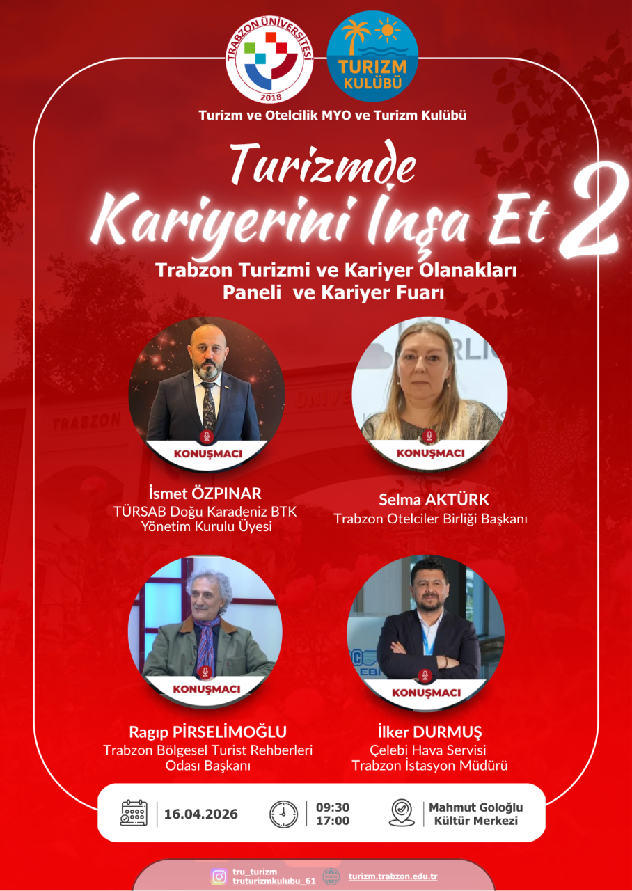 Turizm Haftası kapsamında Turizm ve Otelcilik Meslek Yüksekokulu ile Turizm Kulübü tarafından organize edilen “Turizmde Kariyerini İnşa Et” etkinliğinin ikincisi, 16 Nisan 2026 tarihinde 09.30-17.00 saatleri arasında Mahmut Goloğlu Kültür Merkezi’nde geniş katılımla gerçekleştirildi. Gün boyu süren etkinlik, turizm sektörünün önemli temsilcileri ile öğrencileri bir araya getirerek kariyer planlamasına yönelik önemli katkılar sundu.